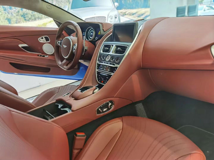 内饰部分,该车整体设计与其它DB11车型无异。但在配色上,新车采用了蓝色和白色的两种浅 色皮质大面积包裹,搭配黑色中控区域,并在中控区域内侧两边有碳纤维装饰,尽显高雅。