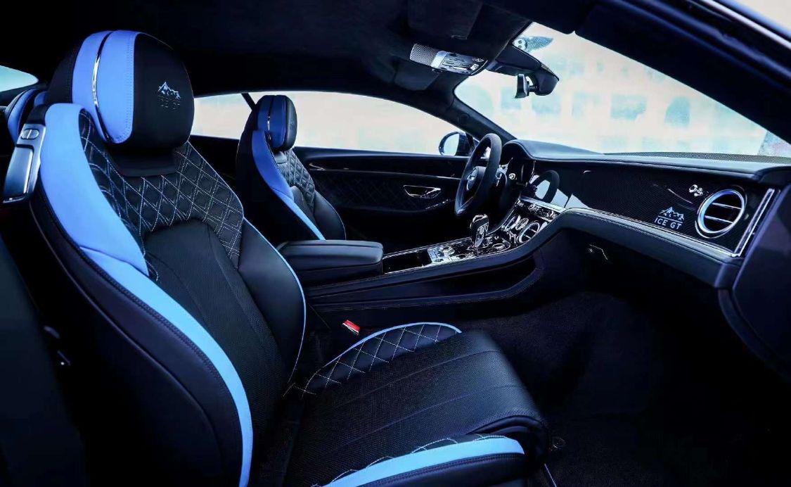 特别版的特点是深黑色主题,几乎所有的外部元素都是黑色的。前格栅和进气口周围的镀铬饰条,前大灯全部变黑。黑色油漆通过应用于前唇、侧裙、轮辋和后扩散器的蓝色配色方案进一步突出。同样的黑色和蓝色主题也适用于新的车轮组。车门上印有专属的蓝色“Ice GT”标志,提醒您这不是普通的欧陆 GT。