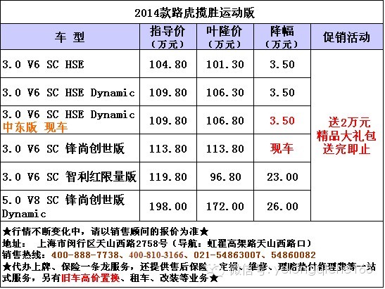 上海叶隆汽车中东版路虎揽胜运动展厅现车近期搞优惠促销,最高优惠3.5万,享新车贷款补贴;旧车置换补贴,送万元装潢大礼包,送保养维修抵用券,近期购车的朋友不妨关注一下,详情拨打购车贵宾热线:400-888-7738