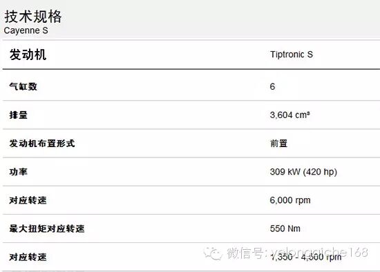 2015款保时捷卡宴S车型搭载3.6升双涡轮增压V6引擎,最大功率为420马力(309kW),最大扭矩为550Nm。