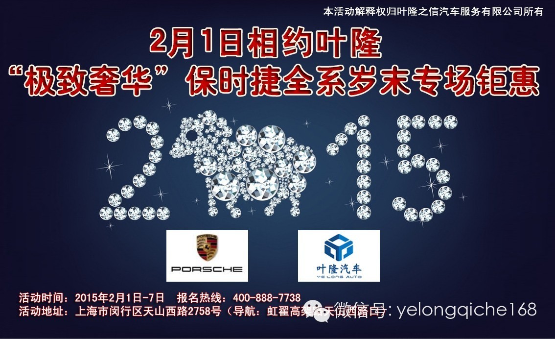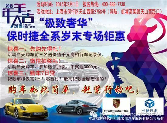 羊年将至,令人期待的全新篇章即将到来。在这辞旧迎新之际,想不想最后再任性一回?上海叶隆保时捷现货中心羊年纳福,邀您羊羊得意过新春。2月1日-7日,我们在展厅为您谱写保时捷全新岁末购车最强音!本次活动叶隆汽车保时捷全系现车倾巢而出,专场放量钜惠,现场订车优惠力度前所未有,超越团购价,还有2万精品豪礼相送,惊喜抽奖等你来参与,要买车过年的朋友们赶紧来报名参加吧!更多活动详情请致电:400-888-7738