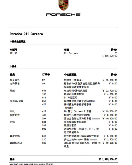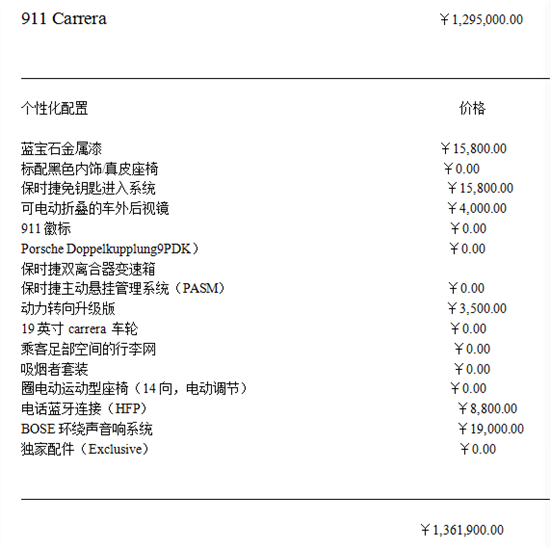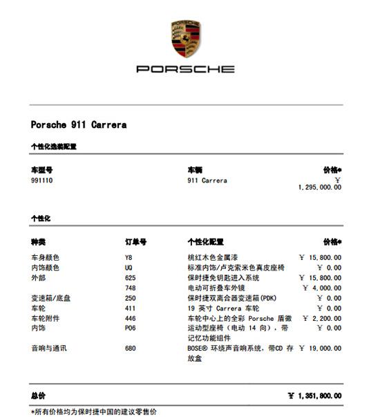 Carrera 3.4L | 129.50 | 103.60 | 25.90 | 一车一配,一车一价,均在配置价基础上再优惠 送20000元精品装潢 |