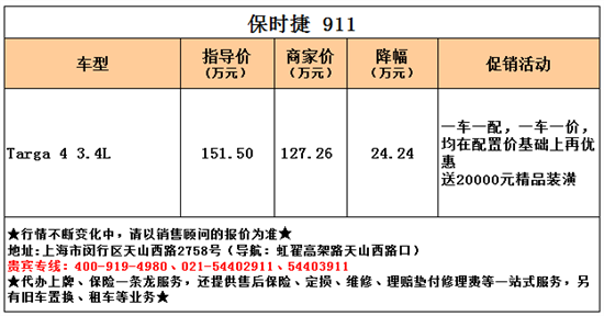 关税下调叶隆先行,保时捷911targa4展厅现车优惠24万,详询:400-888-7738.