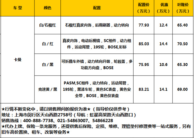 叶隆保时捷中心店内保时捷Boxster促销,现车充足、颜色齐全。目前购车保时捷Boxster最高综合优惠12万元。购车享受新车贷款补贴,旧车置换补贴、装潢大礼包、保养维修抵用券。感兴趣的朋友可以到店咨询购买,详情见下表:
