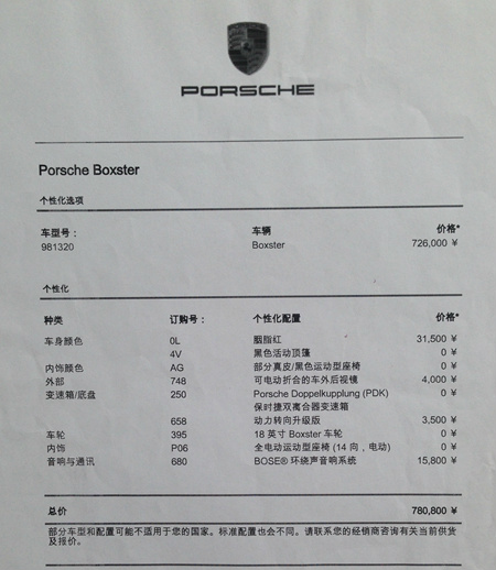 保时捷Boxster是由德国保时捷公司所生产的双座敞篷跑车,Boxster是由Box+ster组合而来。Box来自Boxer,代表保时捷水平对置发动机;ster是Roadster的简写。叶隆保时捷现货中心新到爆款棕顶Boxster胭脂红和红顶Boxster白,外观和配置都相当棒哦!要知道一辆好的跑车是讲究配置的,看配置,你就知道什么叫物有所值!