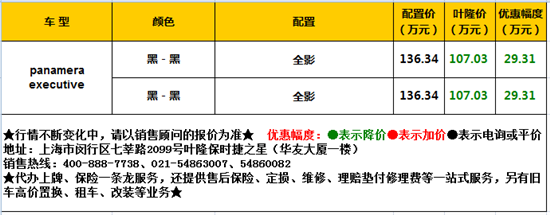 今天推荐的是一款保时捷旗下的四门轿跑 Panamera Executive,3.0T的排量、320匹马力,叶隆展厅现车,组合优惠12.47万!