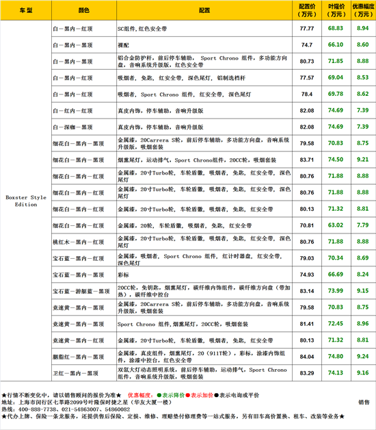 Boxster Style Edition基于Boxster 2.7L车型打造,但外观内饰都有升级,新车配备了动态照明系统 (PDLS) 的双氙气大灯、车身同色滚翻防护杆、19英寸双五辐轮圈以及运动型排气管。