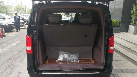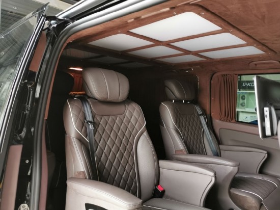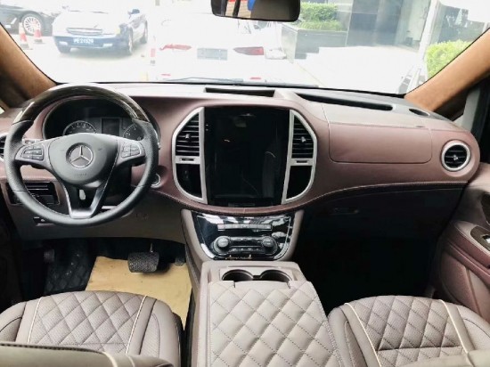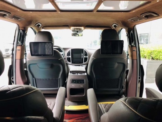 配置:方向盘半真皮半桃木,仪表台包覆,加装大屏导航,前门板包覆,司副座椅包覆,司副座椅加装头枕屏,扶手箱含冰箱,司副座椅后加装脚踏板,驾驶室铺超纤脚垫,中门包覆,后侧壁包覆,侧壁喇叭罩亮饰,尾门包覆,铺印花地板,棕色,地板上层铺透明保护垫,顶棚及ABCD柱包覆进口鹿皮绒,九宫格顶灯,冠润电动座椅,通风、加热、按摩、旋转、电动脚拖,带豪华扶手,奔驰开关,后排电动沙发床,带控制屏,手动窗帘,台湾款式,全车线路,全车塑料件改色,全车桃木及钢琴漆装饰,不锈钢踏板,可拆卸活动桌板,行李架,大灯总成,拉手镀絡亮饰,前中网,铝合金轮毂,更换包围,增加外接充电功能,千斤顶,备胎,工具包,拖车钩,杯托 56万
