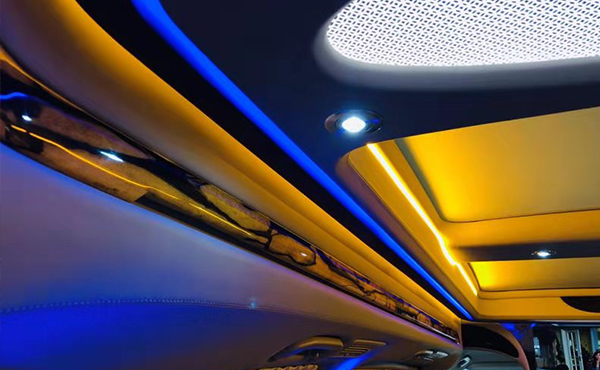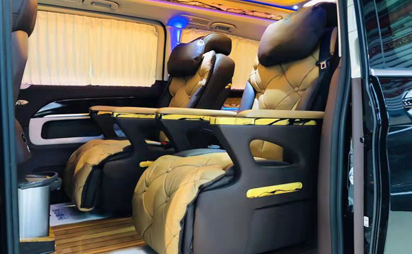 整车统一的内饰色彩,7座的座椅格局,第二排航空VIP座椅和第三排的可放平沙发床, 第二排座椅还可以180°旋转,和便携式桌板组合可以形成一个4人会议的格局,人性化的设计,简约的风格,显得整车异常温馨和温暖。