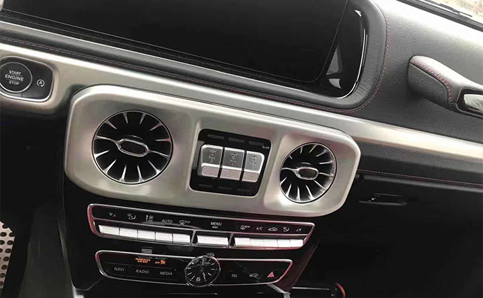 内饰方面:其实才全新一代G级最大的变化。新车换上了奔驰最新家族式的内饰设计,这无疑让G级拥有了旗舰级应有的豪华感,不过经典的副驾驶席扶手和三把锁的开关键依旧延续了经典设计,并设置在中控台最显眼的位置。其中双12.3英寸高清屏,虚拟仪表盘与中控液晶屏融为一体,视觉上形成一个宽屏驾驶舱,中部的涡 扇式空调出风口也颇具设计感,还大量采用了皮革的包覆。此外,全液晶仪表盘+中控大屏的双12.3英寸屏幕设计在新车上也没有缺席,营造出了浓郁的科技感。