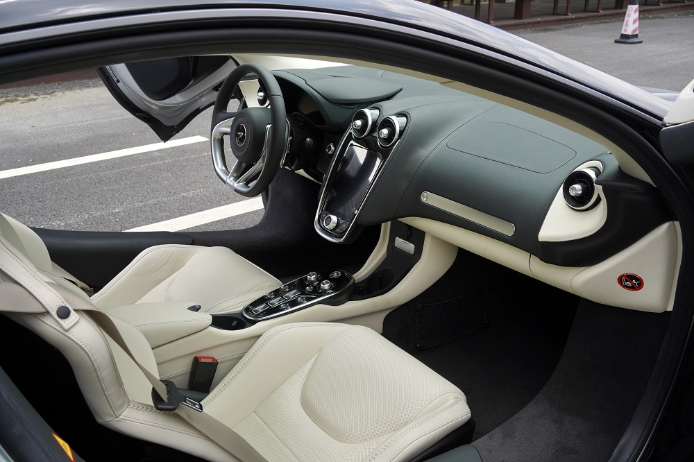 拉开迈凯伦家族独有的蝴蝶门,坐进单体式碳纤维座舱。迈凯伦GT采用了大面积Nappa真皮将整个车内部包裹,少了一丝战斗的气息却多了奢华与优雅的氛围。
